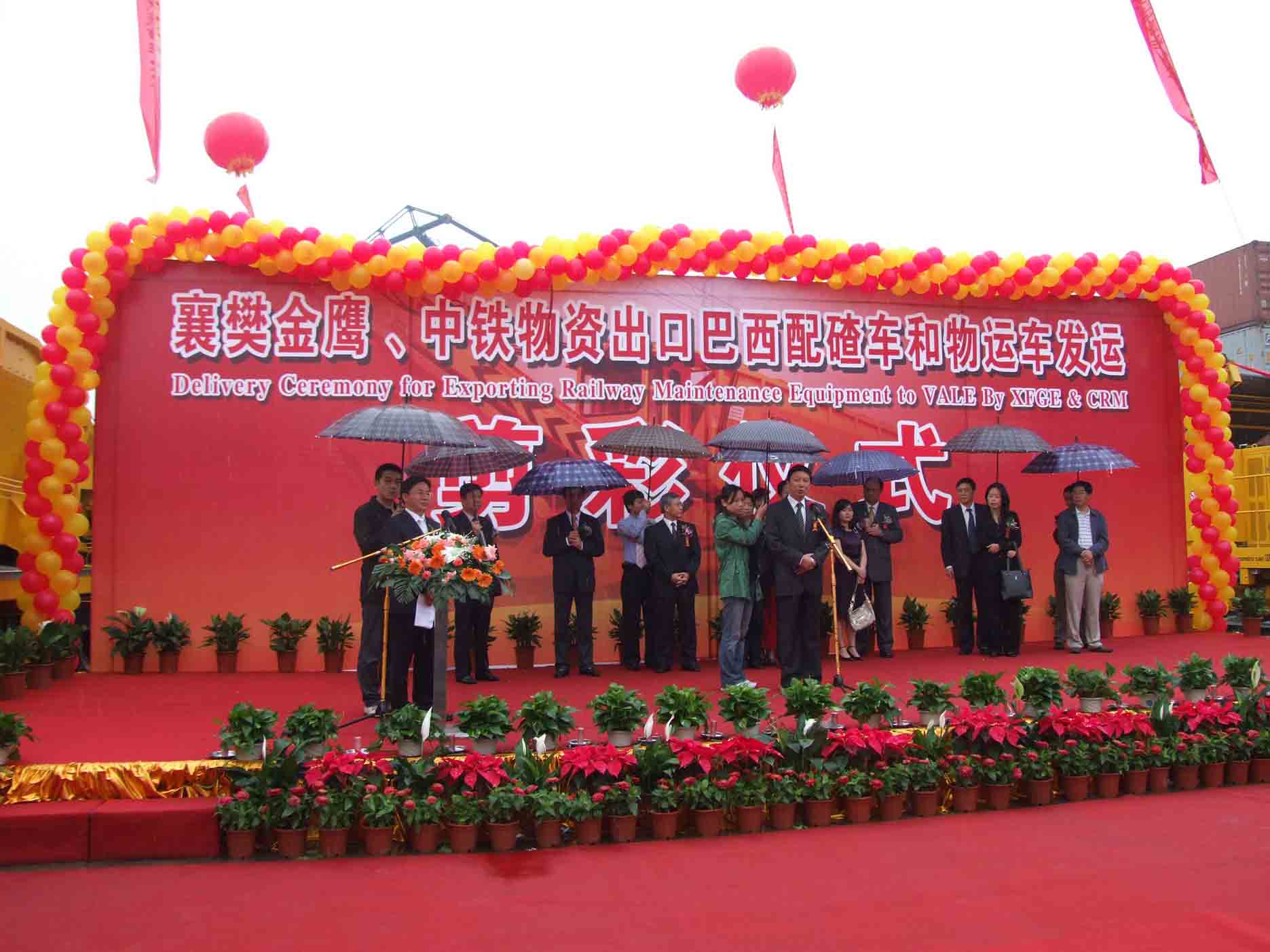 2009年5月26日上午,襄樊金鹰公司出口巴西首批设备发运剪彩仪式在公司5码头堆场隆重举行。国家铁道部、武汉铁路局、巴西淡水河谷公司及襄樊金鹰公司等相关单位负责人参加了仪式。公司顾强生总经理出席了仪式并致辞。
