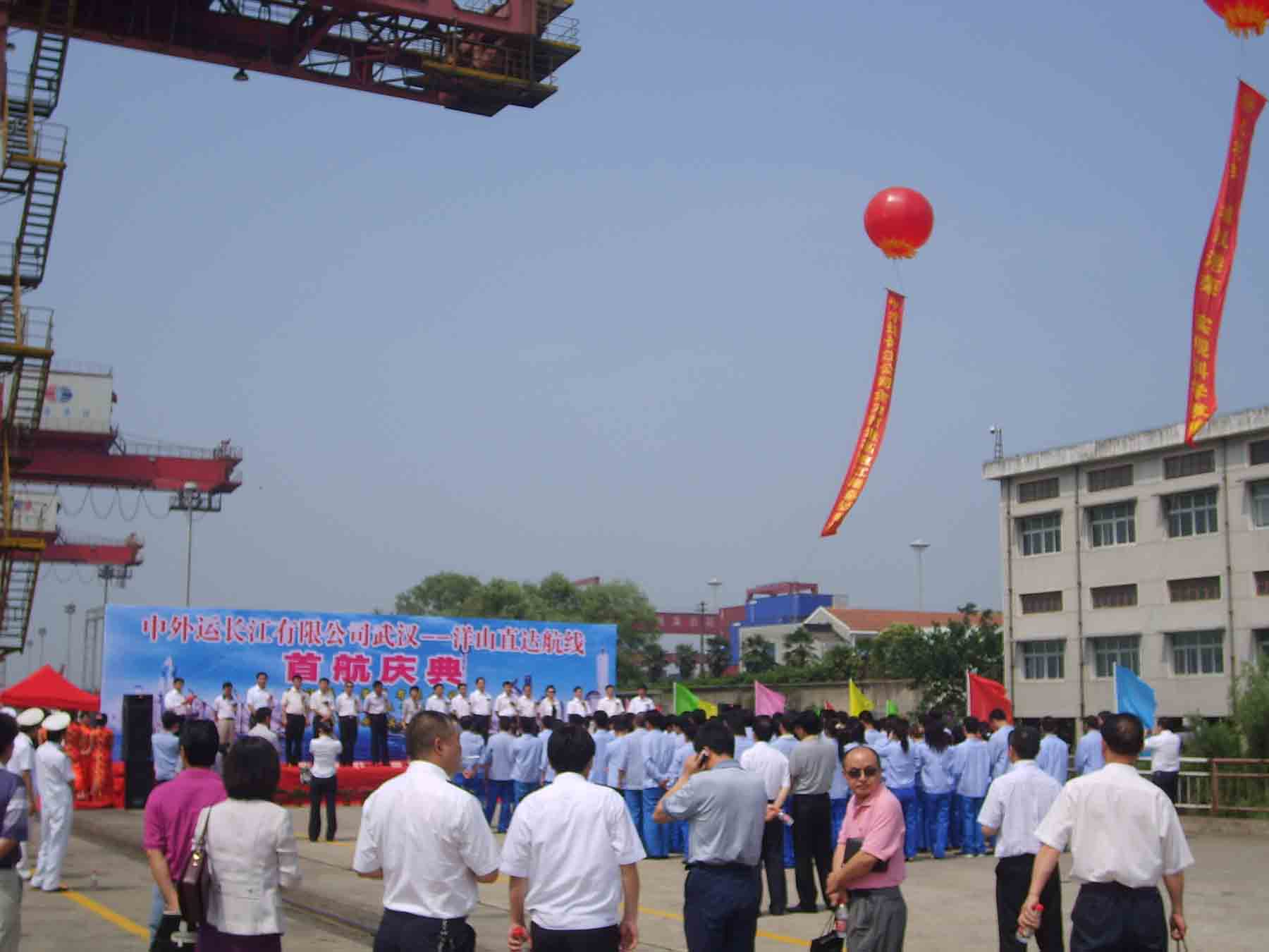 2009年6月18日上午,武汉港至洋山港的江海直达航线首航仪式在公司八码头隆重举行。整个仪式现场喜庆祥和,气氛热烈,充分体现出社会各界对公司开通洋山直航的期待和支持,也充分说明,此次直达航班的开通顺应了地方经济发展对进一步提升港航功能的需求,也喻示着在今后能顺利运作并不断发展。