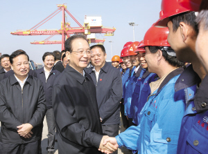 随后,温家宝亲切看望了武港集箱员工(照片为温总理与武港集箱员工亲切握手交谈),与大家亲切交谈。他说,长江黄金水道的建设和利用,要遵循科学规划、合理布局、河道整治、生态保护、永续利用的方针。水运码头的建设要从经济社会发展需要出发,同当地经济社会状况相适应。要综合治理长江黄金水道,确保船舶运输安全。要高度重视生态保护,不仅要充分发挥长江黄金水道的重要作用,而且要使长江成为一条清澈的江河、干净的江河,这就需要按环保标准对港口、船舶排污进行治理,使我们的子孙后代都能永续利用这条黄金水道。