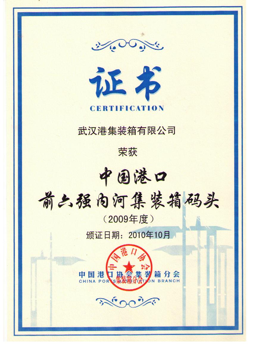 会议公布了2009年全国集装箱码头各个奖项的评比结果,此次评比综合考察了各港口的运营效率、服务质量和经营业绩,武港集箱荣获了“中国港口前六强内河集装箱码头”荣誉称号。这是公司连续三年第三次获得该奖项。充分证明武港集箱当前的营运管理及业绩在内河同行业中保持了较为领先的水平,是武港集箱人的骄傲、也是武汉港的骄傲。该奖项的获得,将激励武港集箱人更加团结一致,不断克服困难,不断提升服务水平,向着更高效率、更好质量港口稳步前行。