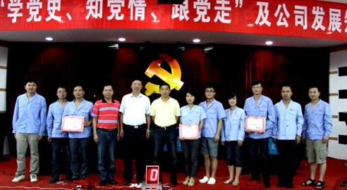 此次知识竞赛系公司为迎接中国共产党建党91周年、庆祝公司合资9周年,按照“喜迎十八大、争创新业绩”主题实践活动方案计划组织。竞赛内容范围涵盖党史、武港集箱发展中大事、要事、集团全委会会议精神、集团“十二五”发展规划目标、“五个转变”内容及安全生产知识等。竞赛活动分两个部分,第一部分是全公司133名在岗党员进行《“学党史、知党情、跟党走”及公司发展知识竞赛100题》笔试测验,此环节在6月中旬已结束,公司党员参与率为100%。第二部分是以支部为代表队的知识答题竞赛。在竞赛现场,各代表队应答如流的出色表现,赢得观众的阵阵掌声。