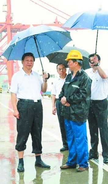 此时,雨越下越大,整个码头前沿平台已经积了一层雨水。车停稳后,只见习总书记挽起裤腿、自己撑着雨伞下了车。习总书记一手撑伞,一手握住了上前迎接的武港集团、武港集箱总经理顾强生的手,在省市领导李鸿忠、阮成发等的陪同下,在码头平台边走边谈。习总书记一连串地询问了生产情况、机械设备情况、内外贸箱量情况、港口建设发展等情况,总经理顾强生一一迅速作答。当听到武港集箱已发展成为长江中上游最大的集装箱码头时,习总书记赞许地笑着点了点头。当得知目前港口机械设备全部都是国产,而且制造水平在全世界名列前茅时很高兴连声说“对、对、对”。