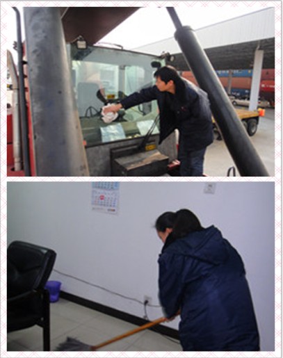 图(二)上青年流动机械司机李永辉保养清理堆高机、下CFS班组青年员工曹晶清扫办公室