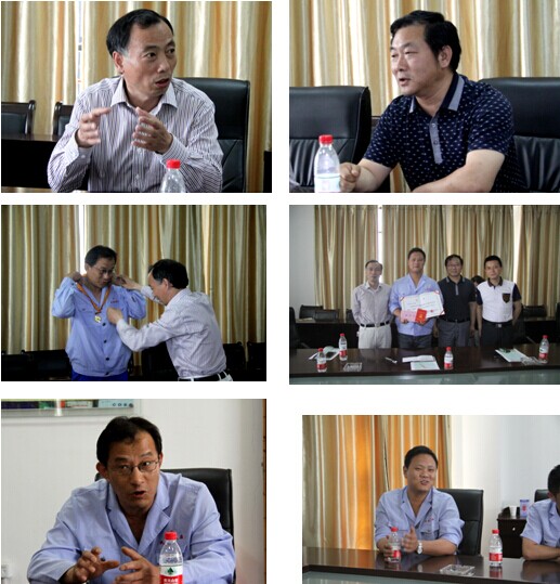 2014年5月27日上午,集团党委副书记、工会主席杨建党,集团工会办公室主任袁硕和相关同志在武港集箱,为获得“湖北省五一劳动奖章”的罗县林和获得“全国交通技术能手”称号的吴头标颁发荣誉证书及奖金,并与一线部分基层员工进行了座谈。