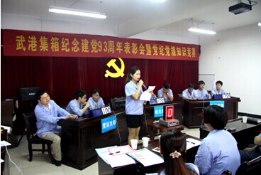 此次知识竞赛系公司为迎接中国共产党建党93周年,按照《武港集箱第十五个党风廉政建设宣传教育月活动方案》计划组织。竞赛内容范围涵盖党章知识以及中共中央《建立健全惩治和预防腐体系2013~2017年工作规划》文件内容。意在让全体党员重温党章,学习党中央新的文件精神,不断增强党性修养。在竞赛现场,工程支部代表队发挥了勇于进取的精神,在啦啦队的助威声中,以准备充分、信心满满的优势,赢得观众的阵阵掌声。营运支部和机关支部代表队也不甘示弱,一路奋起直追。但因几次抢答失误,最后位居第二、第三,仍充分张显了赛场竞技毫不气馁的精神。整个赛场掌声、欢呼声不断。