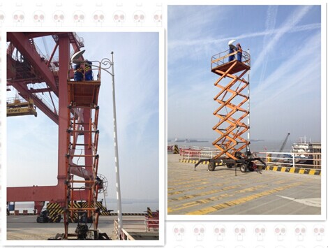 由于大部分故障必须在高空处理,本应请求操作部协助采用叉车叉箱进行高空作业,但考虑到大战四季度的任务繁忙及存在安全隐患,于是工程部设施组临时制定方案,采用工程部的升降车配合作业,由于升降车车轮损坏,设备组又马上进行了紧急修复。