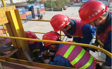 12月1日上午,在工程技术部的设备例行安全检查中,发现港区8号龙门吊拖缆浮动头耐磨块出现明显的磨损。此隐患如果不及时进行处理,龙门吊拖缆浮动头会因天气寒冷造成拖缆倾覆而产生故障停车影响生产。