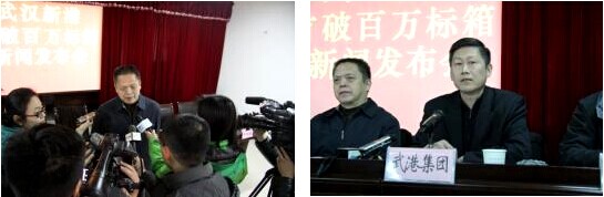 现场见证活动结束后,在武港集箱工程部二楼会议室由武汉市新港管委会主任张林主持,召开了“武汉新港首破百万标箱新闻发布会”。武汉新港管委会副主任邓万想在新闻发布会上发布武汉新港年集装箱吞吐量首破百万标箱的消息,介绍了武汉新港规划建设的有关情况;武汉港务集团总经理陈世丰、武汉中远国际货运有限公司总经理冯波呜,分别代表港口企业和航运企业介绍了服务“百万标箱”的有关情况。新闻发布会还回答了与会新闻媒体记者的提问。