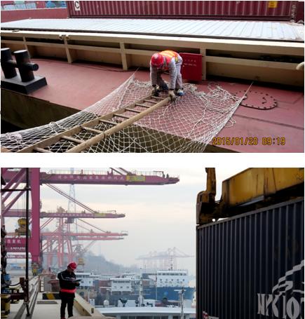 让我们把时间回朔到2015年元月18日早上,集装箱码头3#泊位,航次8106V的远怀1#船已作业完毕。在清晨大约七点钟的时候,远怀1#一名船员在跨档时发生了坠落。幸好该船员落在了安全网上,没有发生大的意外。我们不妨设想一下,假如该船在靠泊时没有按要求铺设安全网和搭跳板,意外坠落也许会衍生出许多许多的结果。