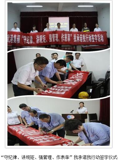 会上党工部长范菁宣读了《武港集箱2015年读书活动实施方案》,部署了今年读书活动要开展的工作;张祥同志作为员工代表宣读了“加强管理,人人有责,从我做起”倡议书,所有与会人员依次在“守纪律、讲规矩、强管理、作表率”我承诺我行动签字活动的横幅上进行了签字,以承诺“自觉强化安全意识、自觉强化执行力、自觉增强诚信意识”,不断推动公司经济发展再上新台阶;活动最后,公司领导盛刚为全体党员上了一堂“守纪律、讲规矩”的党课,在他的讲课中,“规矩”成为高频词汇,从论规矩、谈规矩,到守规矩、识规矩,总共四个方面近万字的讲述,全面解析了守纪律、讲规矩的含义,并通过大量生动实例分析了守纪律、讲规矩的重要性。